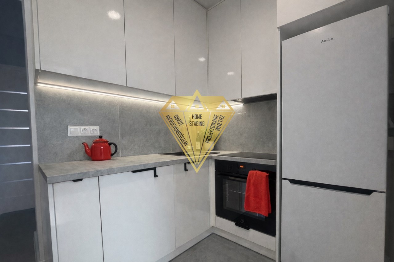 - aneks kuchenny, który jest już wyposażony w sprzęt AGD: płytę indukcyjną, wolno-stojącą lodówkę, pralkę, okap, zlewozmywak,