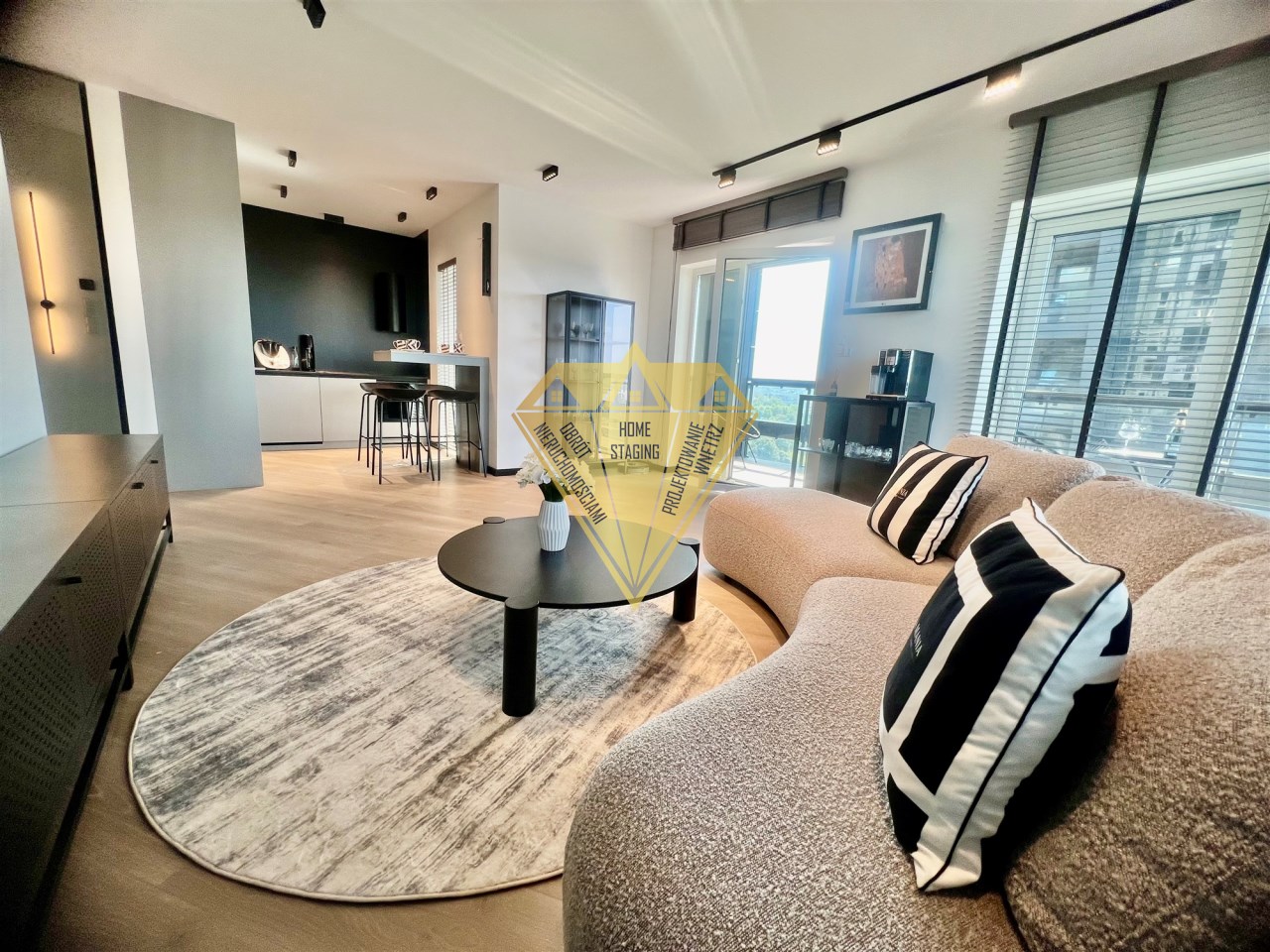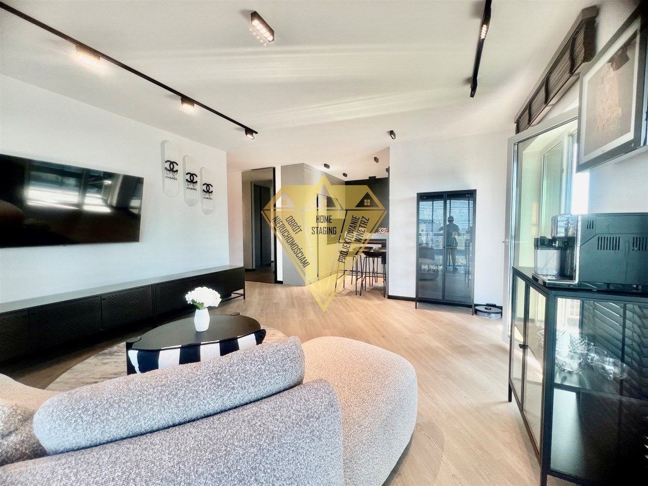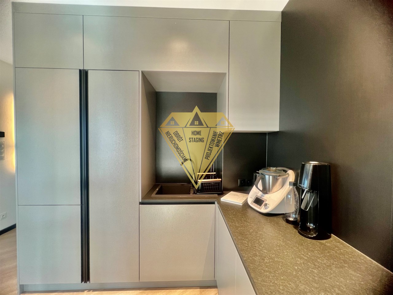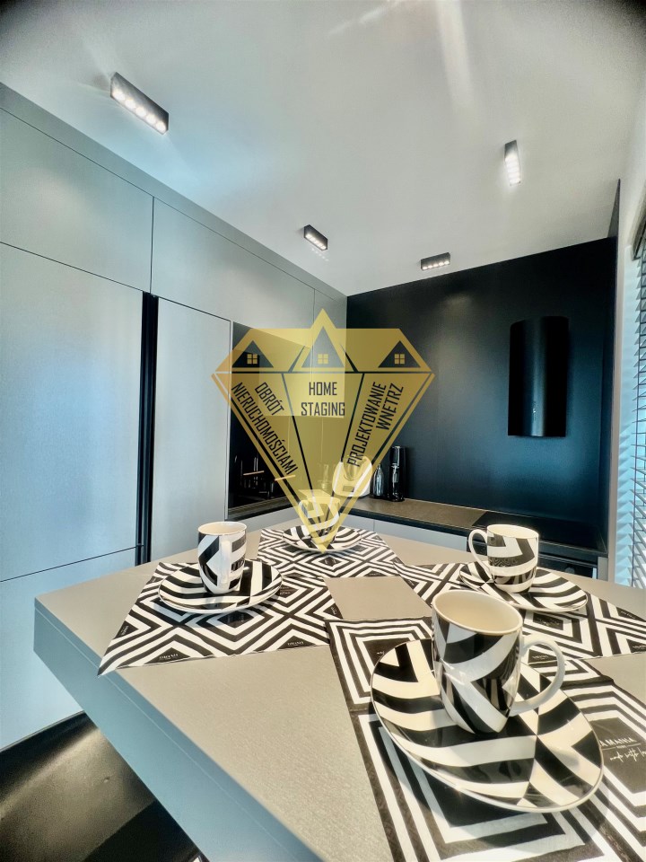 - urządzonego salonu połączonego z obszerną kuchnią w zabudowie wraz ze sprzętem renomowanych marek, wykończonych w wysokim standardzie. Sprzęty jakie znajdziecie w kuchni to m.in. Thermomix, saturator sodastream, czajnik, iRobot Roomba, express do kawy, zastawa stołowa. Powierzchnia salonu wraz z aneksem kuchennym to prawie 32 m2,